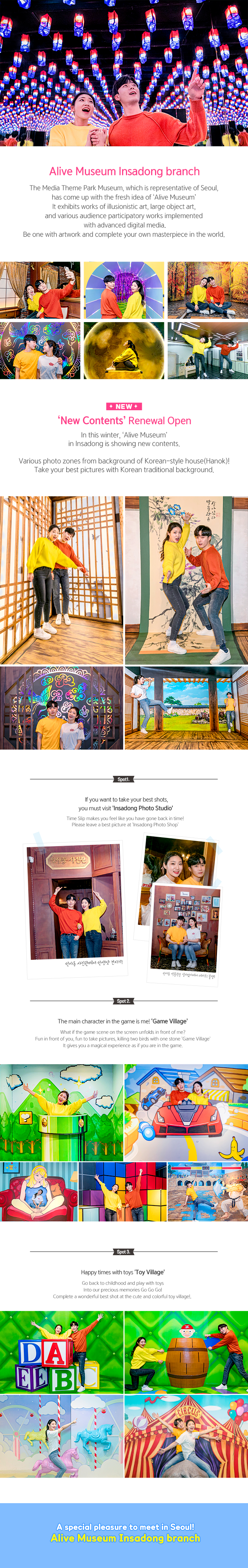 Visitors can be part of the art works by making extraordinary poses, and become the protagonist of one-of-a-kind art works and take their one and only photos. The Insadong Branch of the Alive Museum boasts the largest scale (approx. 1,000 pyeong) of exhibition space in the metropolitan area, and provides you a day as if you are in a movie that the imagined things happening just in front of your eyes.